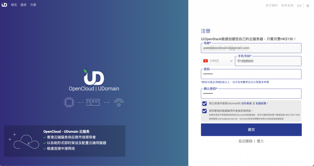 5) a) 输入您的登入密码 b) 再次输入密码,以作确认 c) 点击连结参阅[合约条款]及[私隐政策],并在空格打剔 d) 如希望接收UDomain的促销资讯,请在空格打剔 e) 点击[提交]